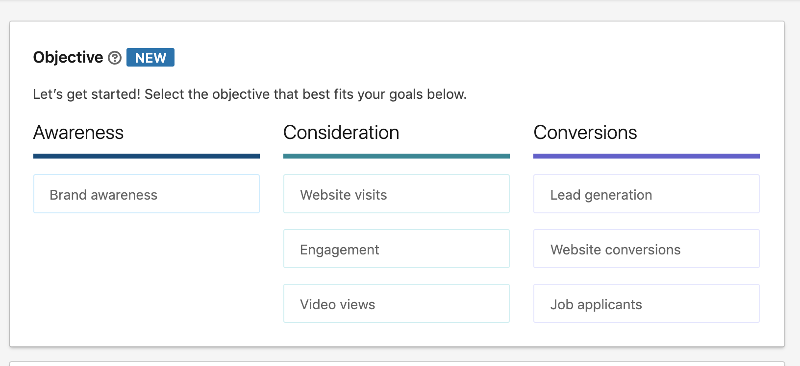 The objectives fall under the Awareness, Consideration and Conversions stages. These are the four objectives you can choose from: