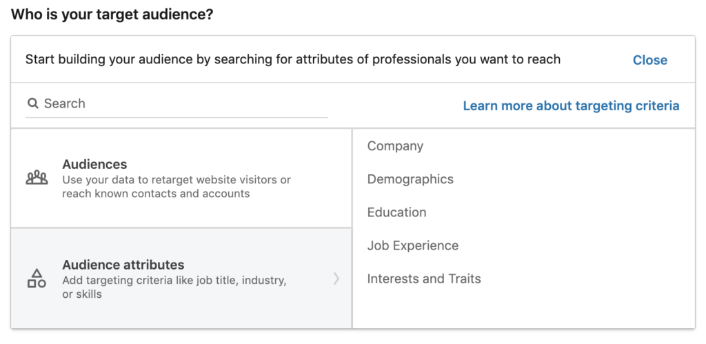 LinkedIn offers a variety of parameters to help you show your ads to the right people. This ensures that your ads are more relevant to the audience you want to reach. You will first start off by selecting the location you would like to include or exclude and also the language. Then you can select audience attributes to further narrow your audience. These attributes include demographics, education, industry, job title, interests and more. You can also exclude certain audiences from seeing your ads.