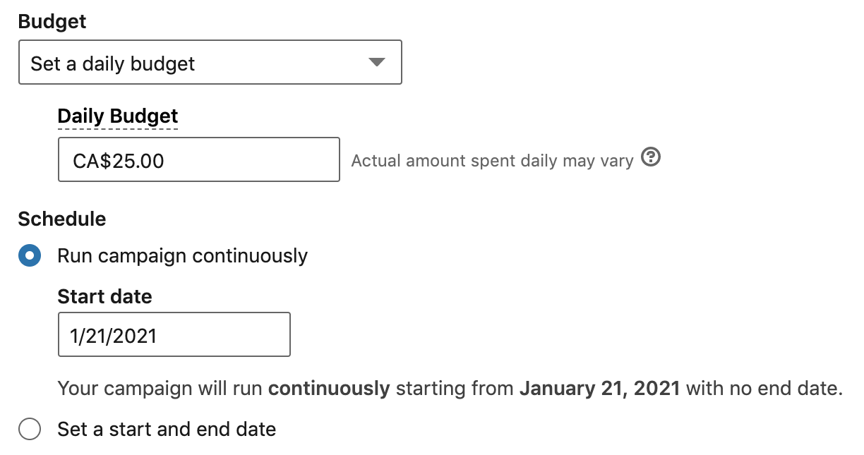 Next, set your daily budget that works best for your business. If it is your first time running these ads, don’t go overboard with the spend. Test your campaigns first to see what results you are getting. Based on these results you can further choose to invest more in these campaigns.